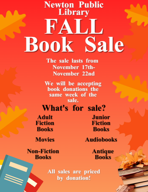 The Newton Public Library’s Bi-Annual Book Sale is currently up! The sale is up from November 17th- November 22nd. We will be accepting book donations the same week of the sale. All sales are priced by donation.